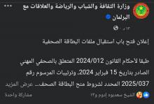 أعلنت لجنة البطاقة الصحفية عن فتح باب استقبال ملفات الصحفيين الراغبين في الحصول على البطاقة الصحفية، ابتداء من 10 نوفمبر إلى 31 دجمبر 2025، لدى مكتب اللجنة بوزارة الثقافة.