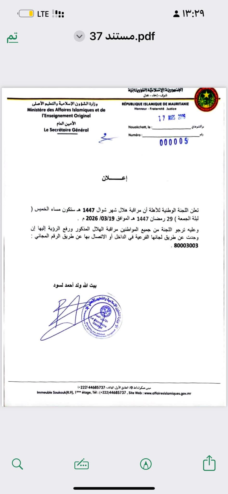 دعت اللجنة الوطنية للأهلة في موريتانيا عموم المواطنين والمقيمين إلى تحري رؤية هلال شهر شوال مساء الخميس 29 رمضان 1447. ودعت اللجنة في بلاغ صدر اليوم الثلاثاء إلى موافاتها بنتائج الرؤية عبر لجان الفرعية في الولايات أو عبر الاتصال الهاتفي.