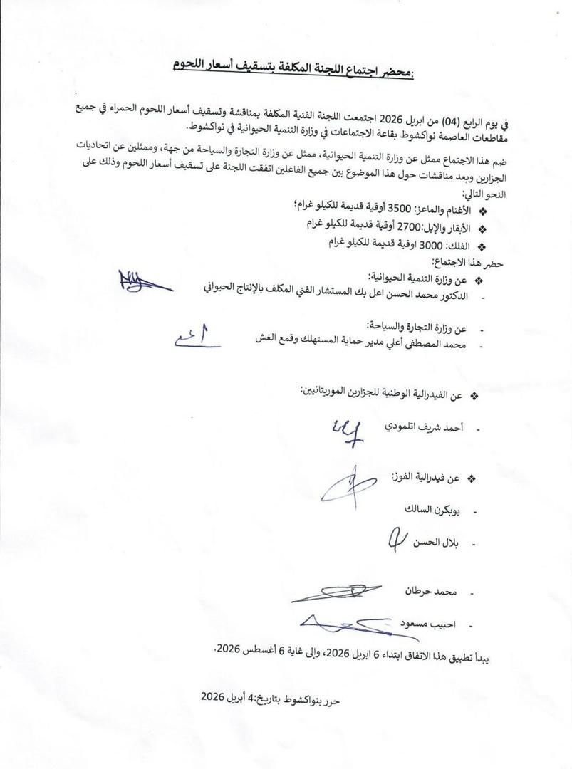 ووفق محضر الاتفاق الذي اطلعت عليه "بشائر"، فقد اتفق الطرفان على تسقيف أسعار بيع اللحوم في العاصمة بدءا من 6 إبريل 2026 وحتى 6 أغشت من نفس العام، وذلك وفق البيانات التالية: