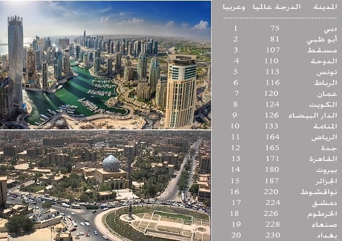 الدراسة التي شملت 230 مدينة صنفت دبي الأولى عربيا رغم احتلالها المرتبة 75 عالميا فيما جاءت نواكشوط في المرتبة 16 على مستوى المدن العربية.