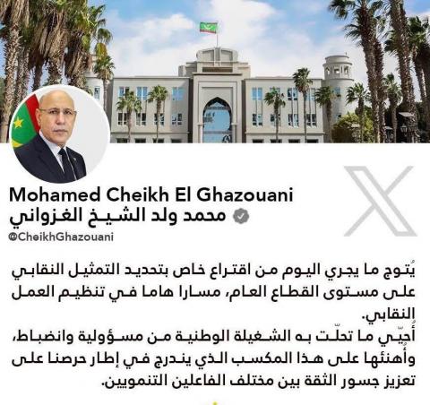 قال الرئيس محمد ولد الغزواني إن انتخابات التمثيلية النقابية التي انطلقت السبت تشكل تتويجًا لمسار مهم في تنظيم العمل النقابي بموريتانيا.