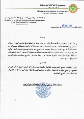 علنت وزارة الثقافة والفنون والاتصال والعلاقات مع البرلمان تعليق تراخيص جميع المهرجانات الثقافية والفنية المبرمجة في الولايات الداخلية، سواء ذات الطابع الدولي أو الوطني أو الجهوي، وذلك إلى حين تهيؤ الظروف الملائمة لتنظيم