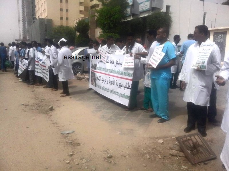 نظمت نقابات الأطباء في موريتانيا اليوم الاثنين وقفة احتجاجية على أوضاع قطاع الصحة وظروف عمل الأطباء، وذلك أمام مقر وزارة الصحة الموريتانية بنواكشوط، وبحضور عناصر من الشرطة.