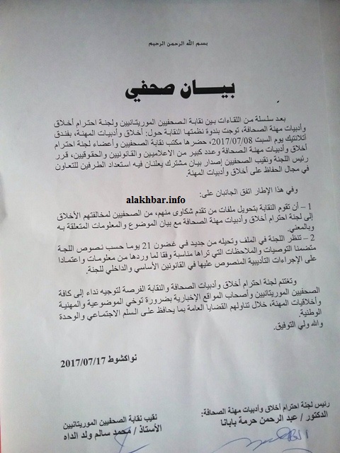 أحالت نقابة الصحفيين الموريتانيين تحديد الإجراءات المتخذة ضمن حملتها لتنقية المهنة إلى لجنة احترام أخلاق وأدبيات المهنة وذلك بموجب اتفاق موقع بين الطرفين يحيل ملفات من تُقدم شكاوى منهم، من الصحفيين لمخالفتهم الأخلاق، إلى لجنة الأخلاقيات.