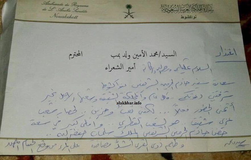 واعتذر ولد بمب في رد وجهه للسفير السعودي عن الحضور لحفل تخليد اليوم الوطني الـ 87 للمملكة العربية السعودية المقام ليلة البارحة في منزل السفير بنواكشوط.