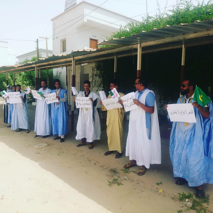 تظاهر عدد من الناشطين الشباب المحسوبين على حراك "محال تغيير الدستور" أمام مقر اتحاد الأدباء والكتاب الموريتانيين احتجاجا على ما أسموه "مهزلة النشيد الجديد".