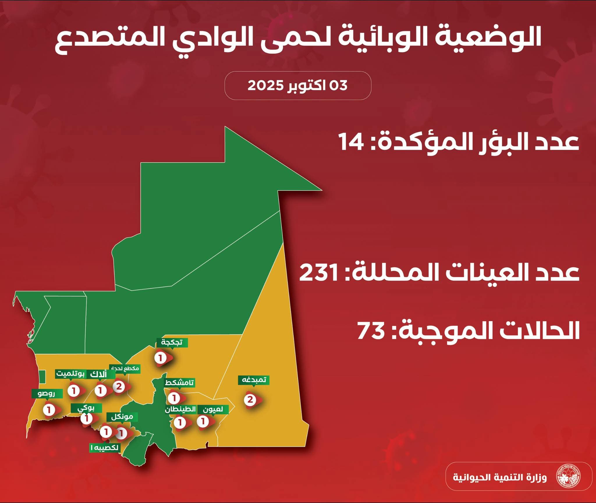أعلنت وزارة التنمية الحيوانية أن المصالح البيطرية سجلت حتى الثالث من أكتوبر 2025 أربع عشرة بؤرة لحمى الوادي المتصدع، موزعة على 12 مقاطعة في ست ولايات داخل البلاد.