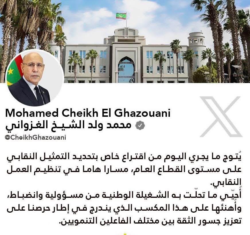 وأوضح ولد الغزواني، في تغريدة على منصة "إكس"، أن هذا الاقتراع يمثل مكسبًا للعمال، مشيدًا بمسؤولية الشغيلة الوطنية وانضباطها خلال سير العملية الانتخابية.